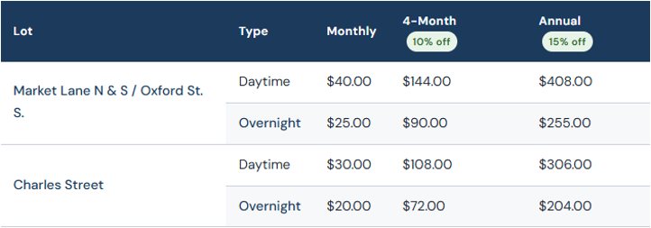 The Town of Ingersoll's Downtown Permit Parking Program provides dedicated monthly, quarterly, and annual parking spaces in four municipal lots within the downtown core. Permits are available for daytime use (8:00 a.m. to 6:00 p.m.) or overnight use (6:00 p.m. to 8:00 a.m.), Monday through Sunday.